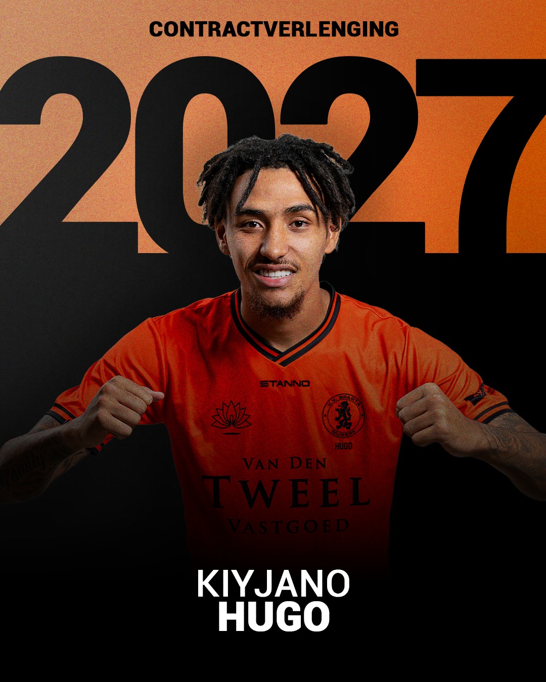 Kiyjano Hugo heeft zijn contract bij Sparta Nijkerk verlengd tot de zomer van 2027. Daarmee gaat hij zijn vierde seizoen bij onze club in. In de overeenkomst is ook een optie voor een extra jaar opgenomen, waardoor een verblijf tot 2028 tot de mogelijkheden behoort.