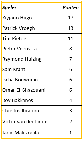 Tijdens competitiewedstrijden worden er door een groepje enkele supporters punten gegeven aan de beste spelers van Sparta Nijkerk 1. Het gaat hierbij om 6 punten, meer indien nodig. Normaal gesproken zijn deze te verdelen in 3, 2 en 1 punt, behalve bij gelijke standen kan het voorkomen dat punten anders moeten worden verdeeld in bijvoorbeeld 3,2,1,1 of 3,2,2 etc.