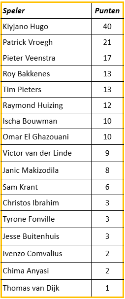 Tijdens competitiewedstrijden worden er door een groepje enkele supporters punten gegeven aan de beste spelers van Sparta Nijkerk 1. Het gaat hierbij om 6 punten, meer indien nodig. Normaal gesproken zijn deze te verdelen in 3, 2 en 1 punt, behalve bij gelijke standen kan het voorkomen dat punten anders moeten worden verdeeld in bijvoorbeeld 3,2,1,1 of 3,2,2 etc.