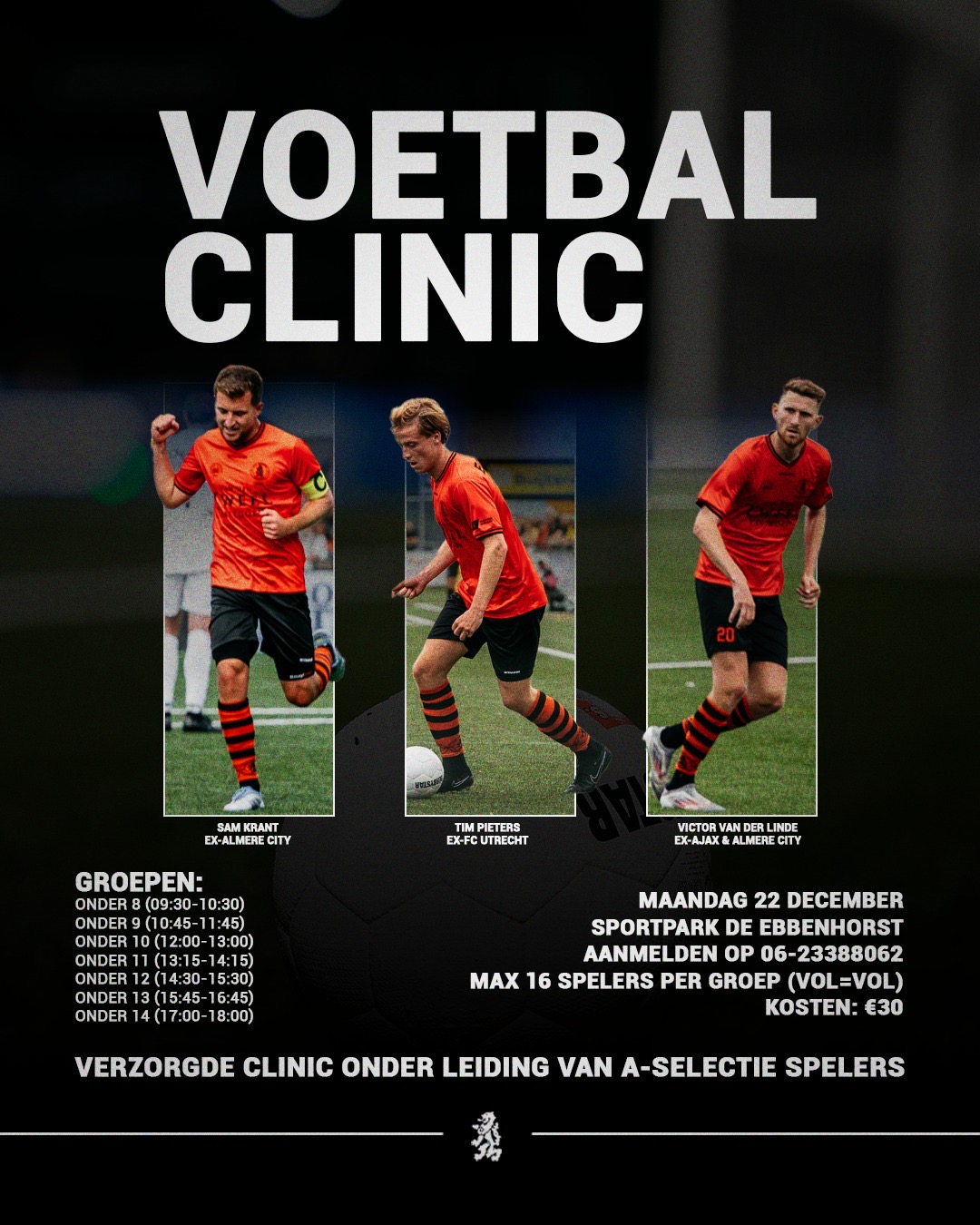 De Voetbalclinic wordt verzorgd door: “Ajax Beul” Tim Pieters (ex FC Utrecht), Victor van der Linde (ex Ajax en Almere City) en Sam Krant (aanvoerder Sparta Nijkerk en ex Almere City).